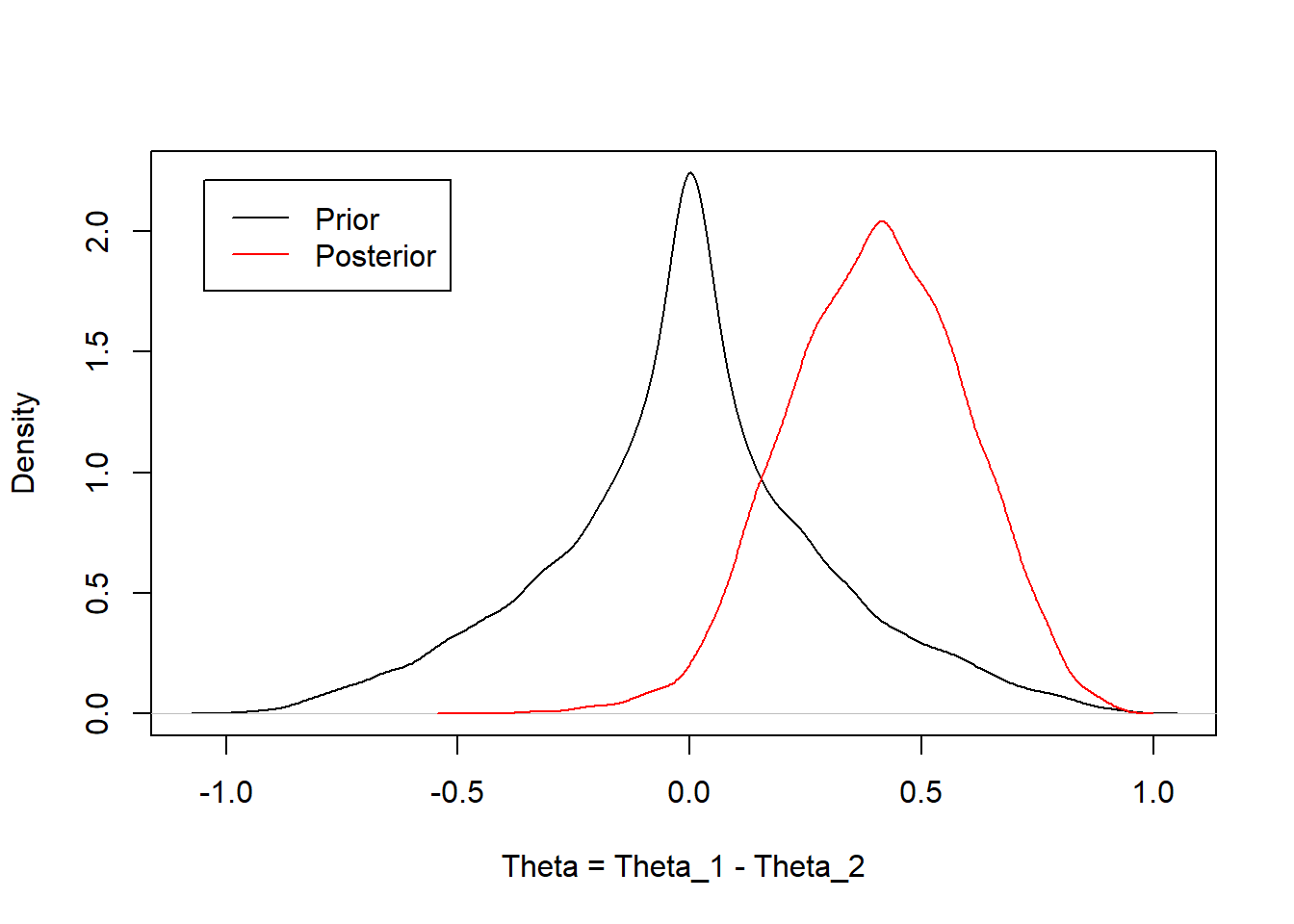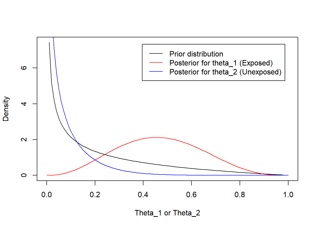 plot(function(x) dbeta(x,a,b), xlab="Theta_1 or Theta_2", ylab="Density")plot(function(x) dbeta(x,a+3,b+2), add=TRUE, col='red')plot(function(x) dbeta(x,a+0,b+5), add=TRUE, col='blue')legend("topright",inset=.05,c("Prior distribution","Posterior for theta_1 (Exposed)","Posterior for theta_2 (Unexposed)"), col=c("Black","Red","Blue"), lty=1)