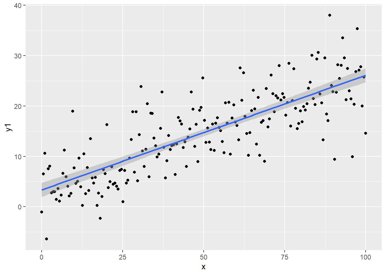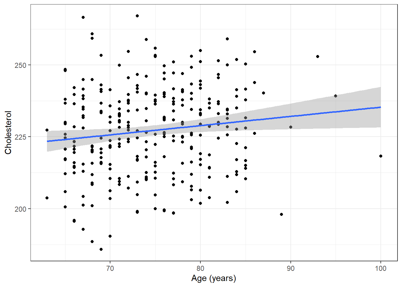 ggplot(plotdata, aes(x=age, y=chol)) + geom_point() + ylab("Cholesterol") + xlab("Age (years)") + theme_bw() + geom_smooth(method="lm")