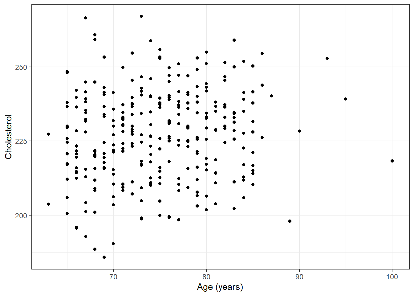 ggplot(plotdata, aes(x=age, y=chol)) + geom_point() + ylab("Cholesterol") + xlab("Age (years)") + theme_bw()