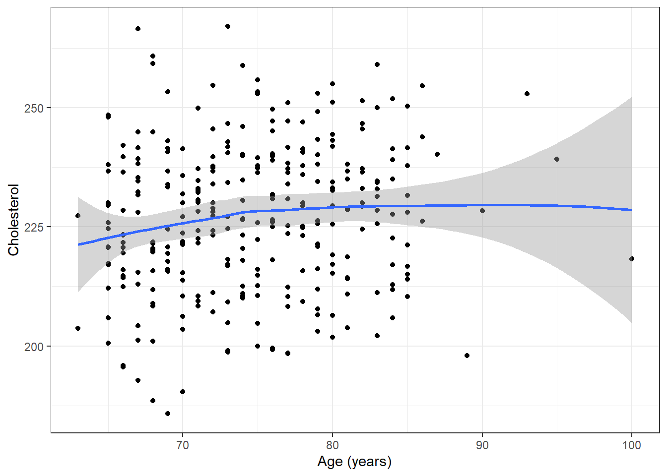 ggplot(plotdata, aes(x=age, y=chol)) + geom_point() + ylab("Cholesterol") + xlab("Age (years)") + theme_bw() + geom_smooth()