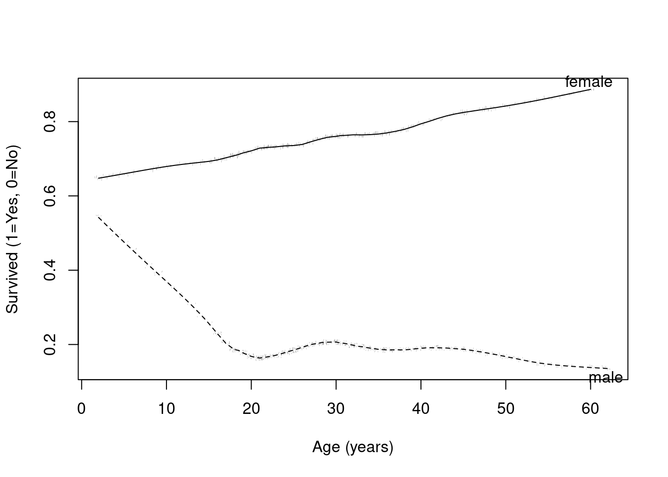 Here is the plot again describing the trends we see in survival by age and sex (using plsmo).