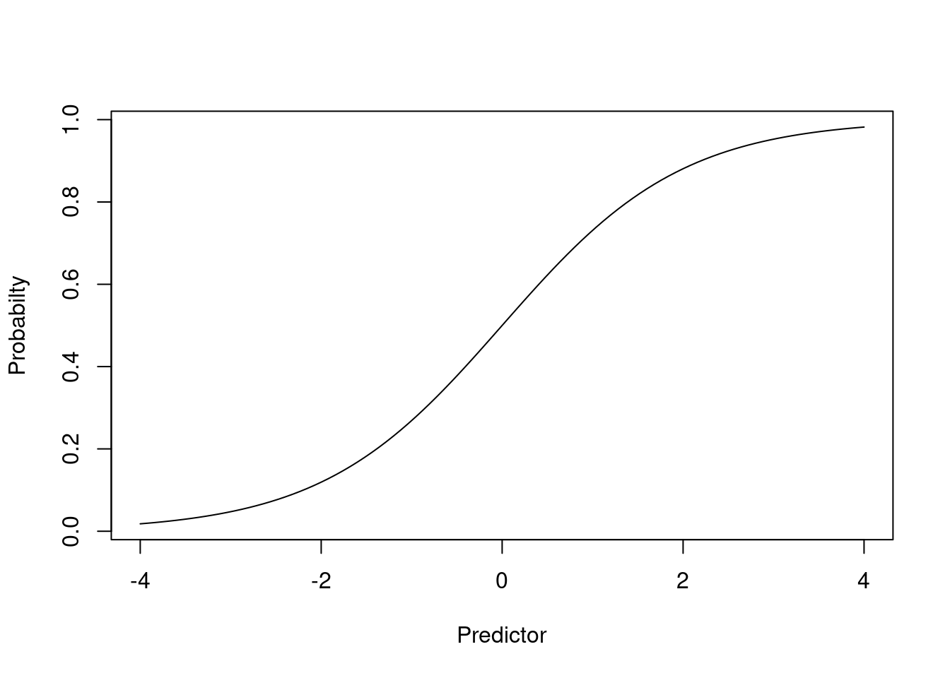 plot(function(x) expit(x), -4,4, ylab="Probabilty", xlab="Predictor")