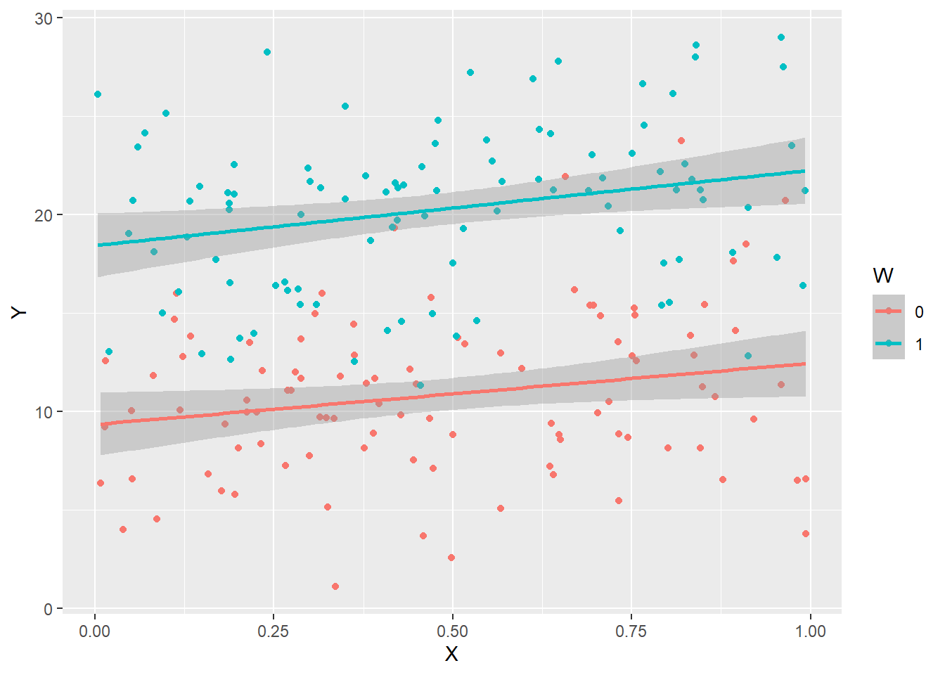 precisiondata$Y <- 10 + 1.5*precisiondata$X + 10*precisiondata$W + rnorm(n,0,4)