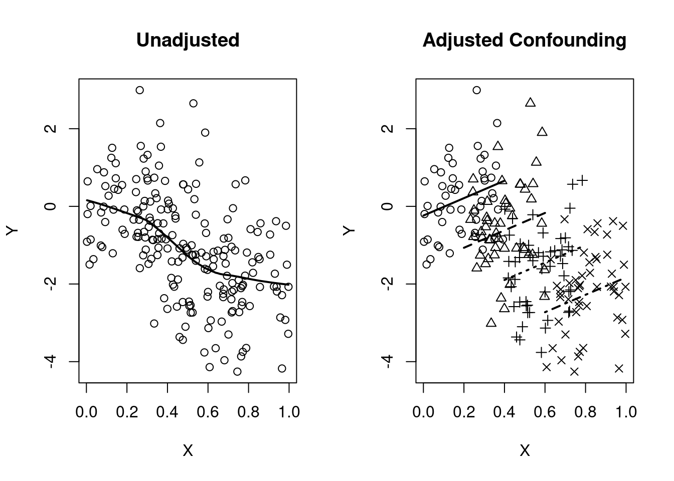 plot(X,Y, pch=(grp+1), main="Adjusted Confounding")