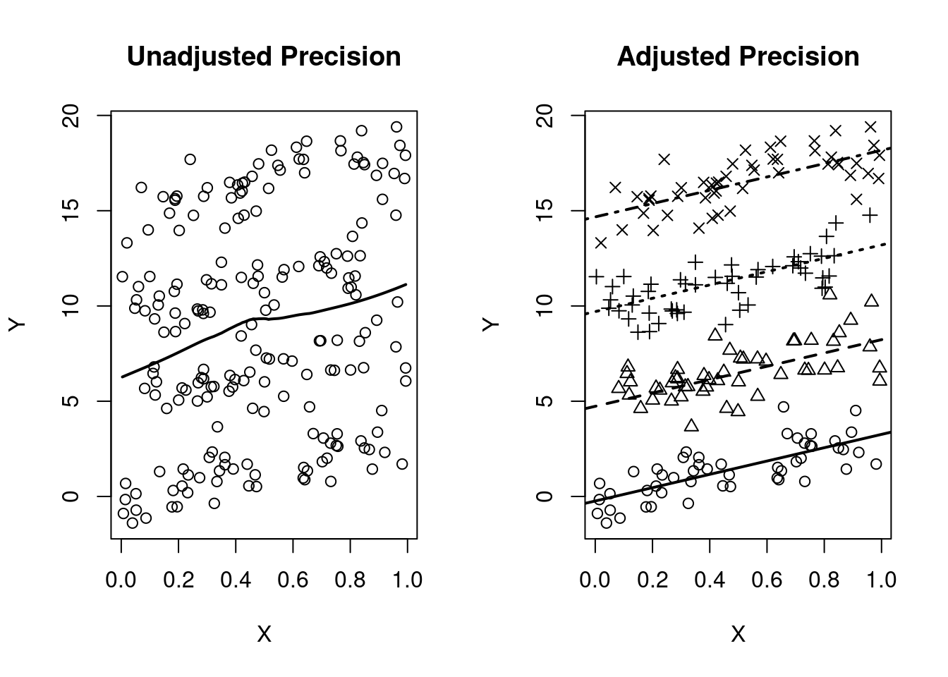 plot(X,Y, main="Adjusted Precision", pch=(grp+1))