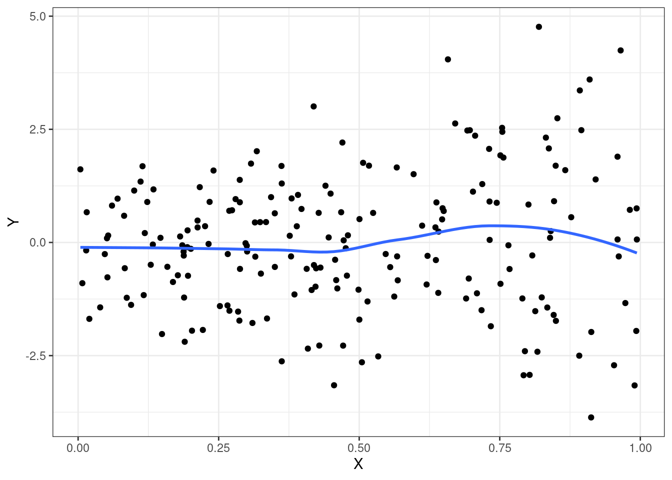 ggplot(emplot, aes(x=X, y=Y)) + geom_point() + geom_smooth(se=FALSE) + theme_bw()