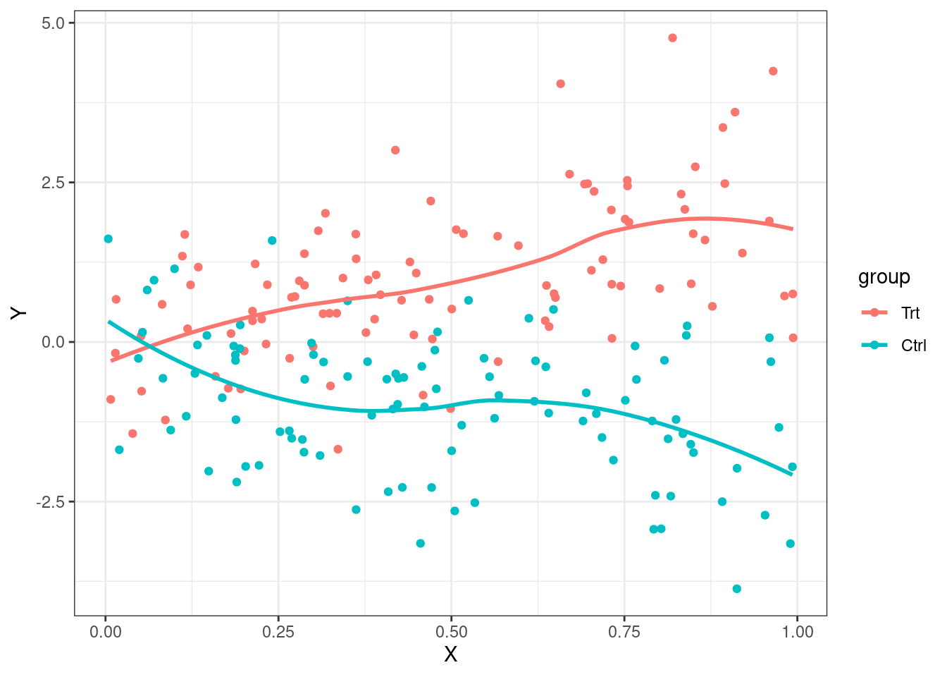When analyzing difference of means of continuous data, stratified smooth curves of the data are non-parallel