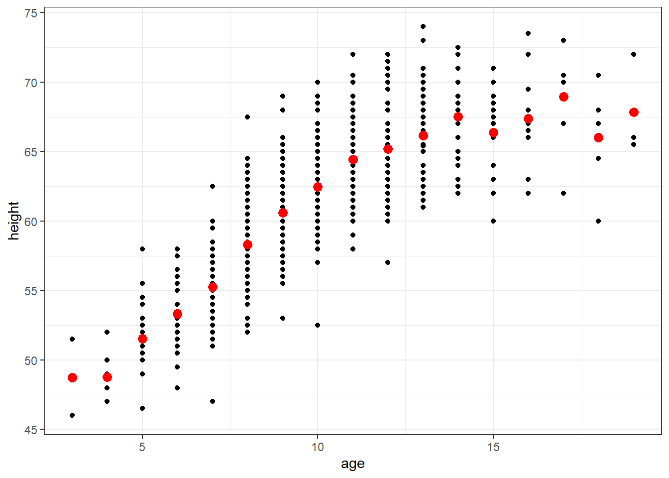 geom_point(data=newdata, aes(x=age, y=ht.dummy), col="Red", size=3) +
