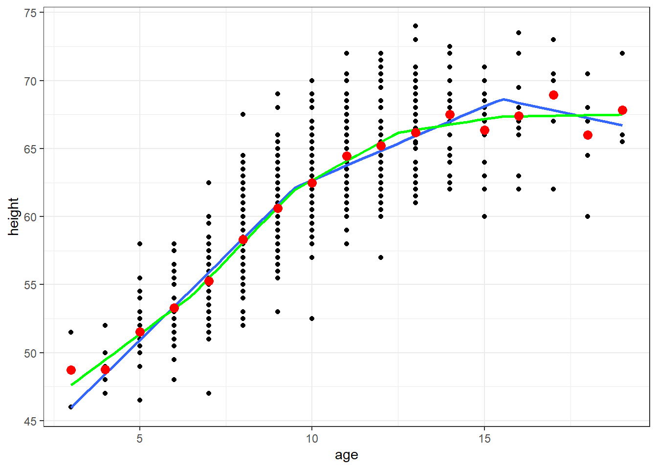 geom_point(data=newdata, aes(x=age, y=ht.dummy), col="red", size=3) +