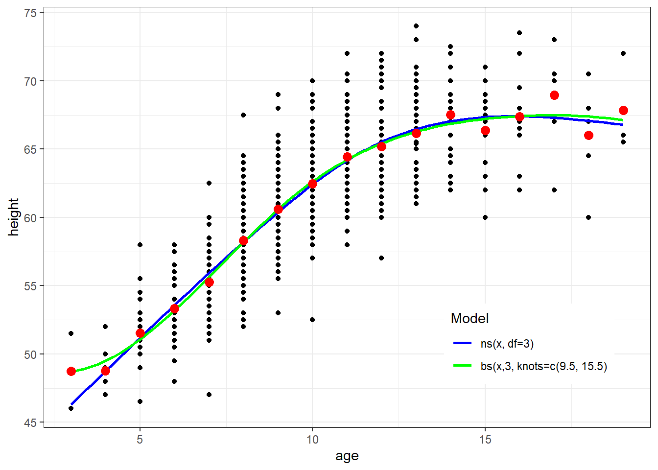 scale_colour_manual(name="Model", values=c("Blue", "Green"), labels=c("ns(x, df=3)","bs(x,3, knots=c(9.5, 15.5)")) + theme(legend.position = c(0.8, 0.2))