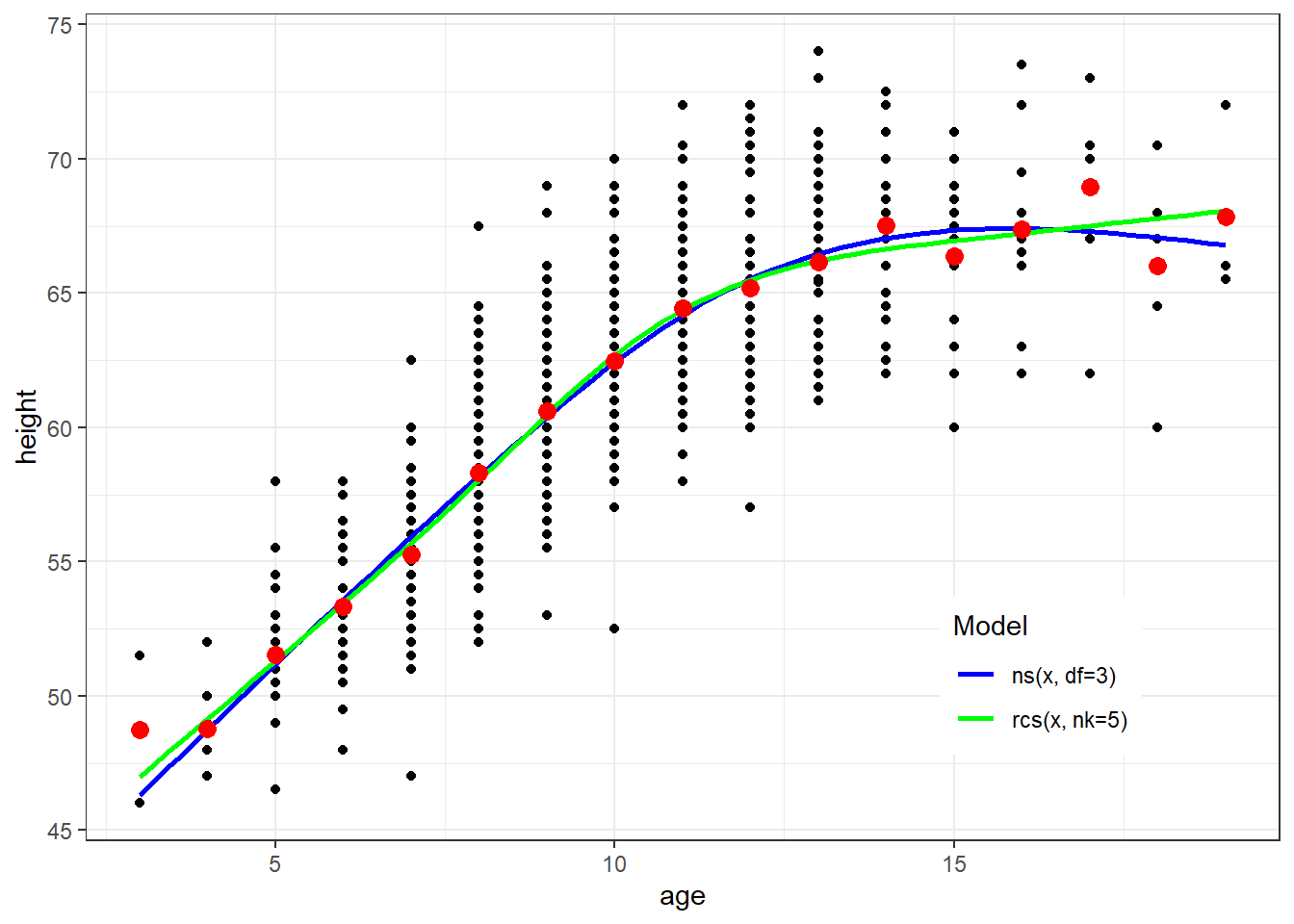 scale_colour_manual(name="Model", values=c("Blue", "Green"), labels=c("ns(x, df=3)","rcs(x, nk=5)")) + theme(legend.position = c(0.8, 0.2))