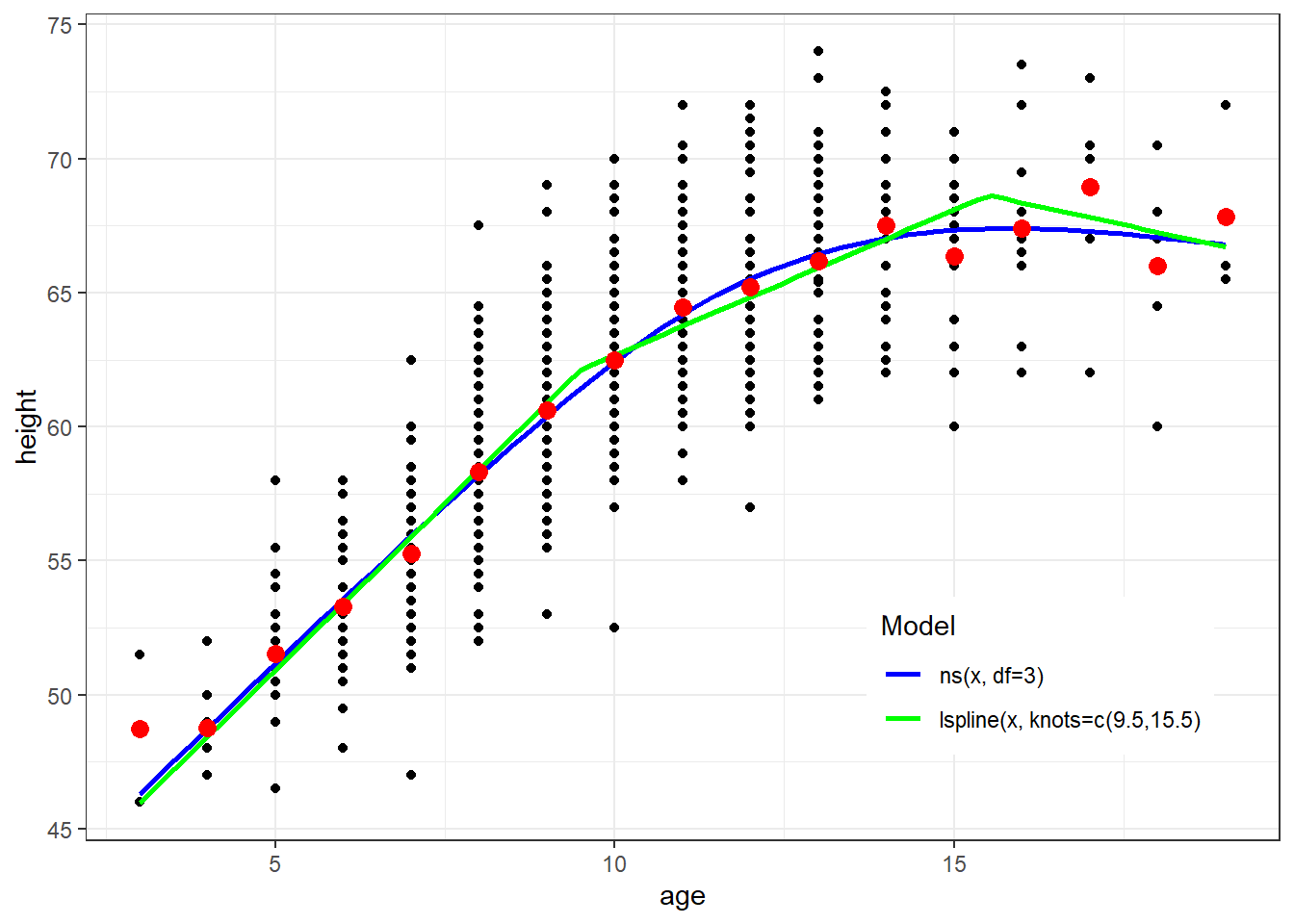 scale_colour_manual(name="Model", values=c("Blue", "Green"), labels=c("ns(x, df=3)","lspline(x, knots=c(9.5,15.5)")) + theme(legend.position = c(0.8, 0.2))