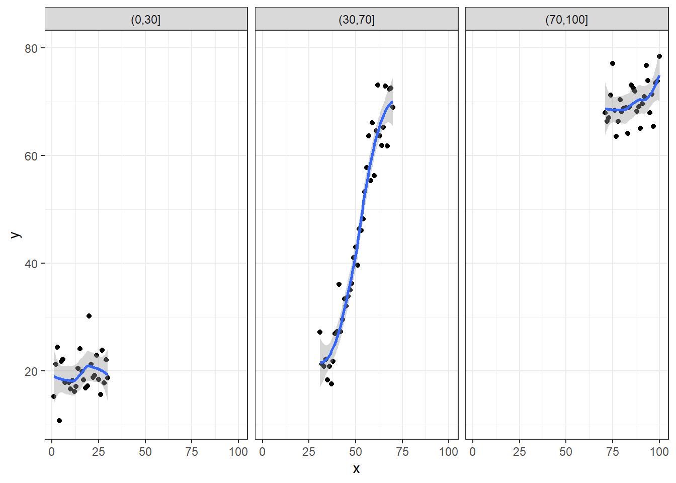 Formal test can be conducted to determine if the slope is significantly different on ranges of \(X\) (hierarchical models)