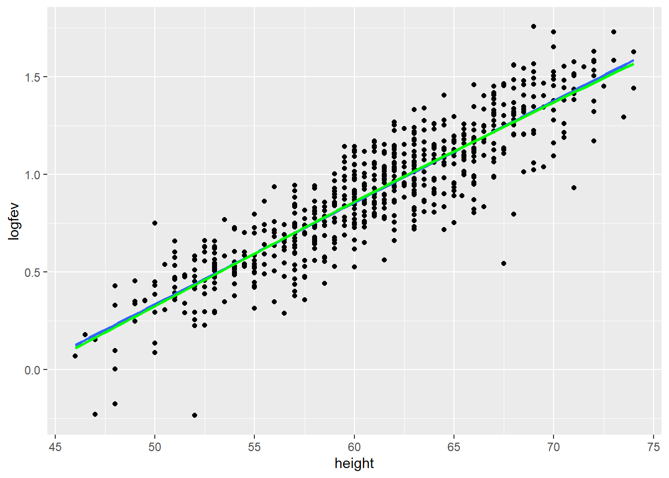 ggplot(fev, aes(x=height, y=logfev)) + geom_point() + geom_smooth(method=lm, se=FALSE) +