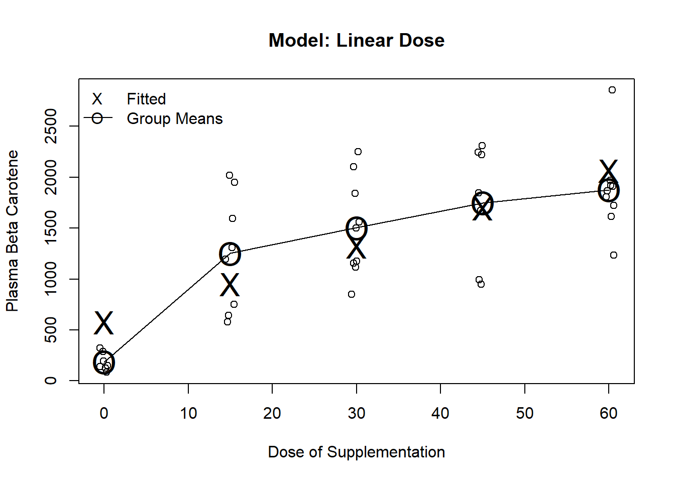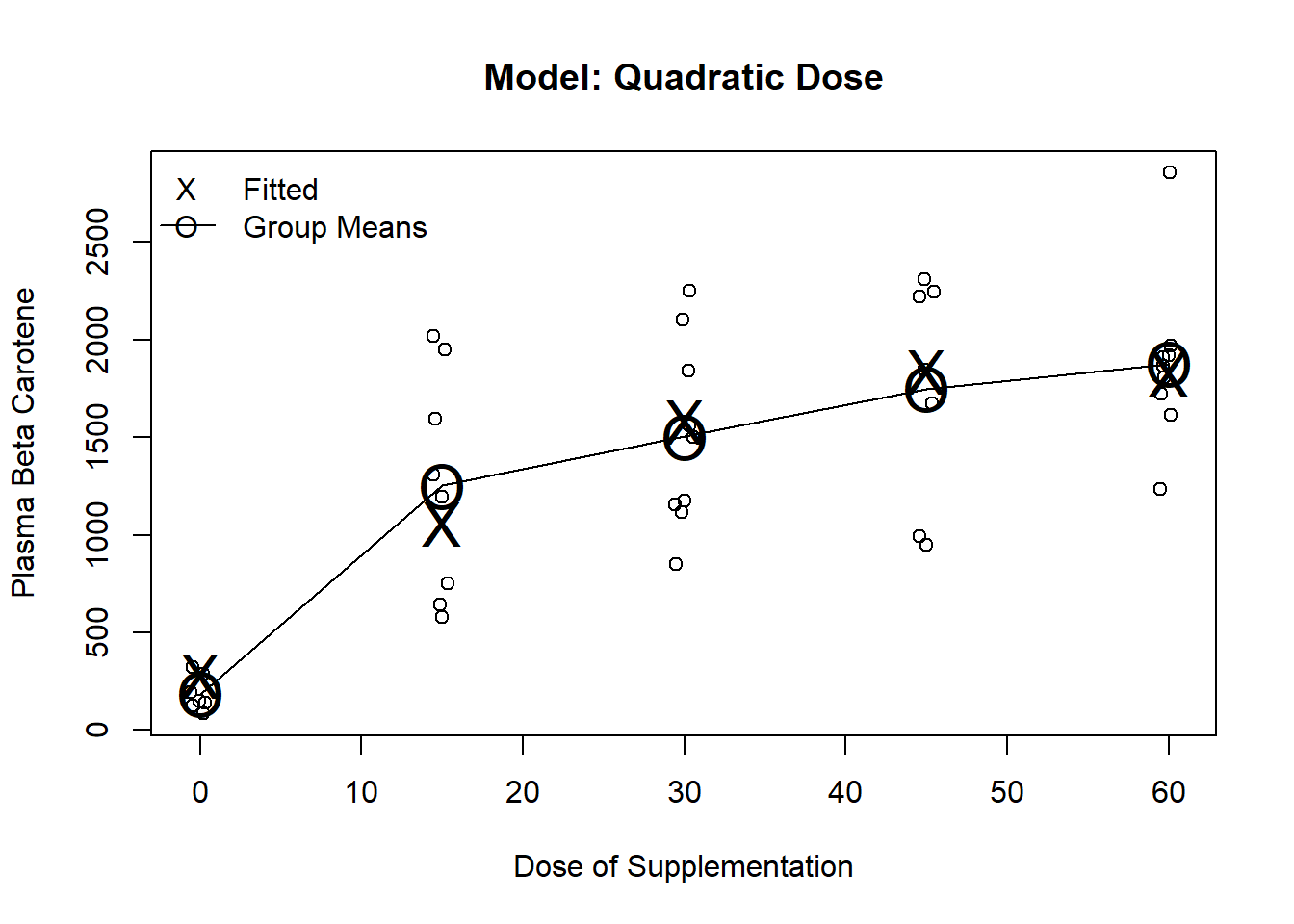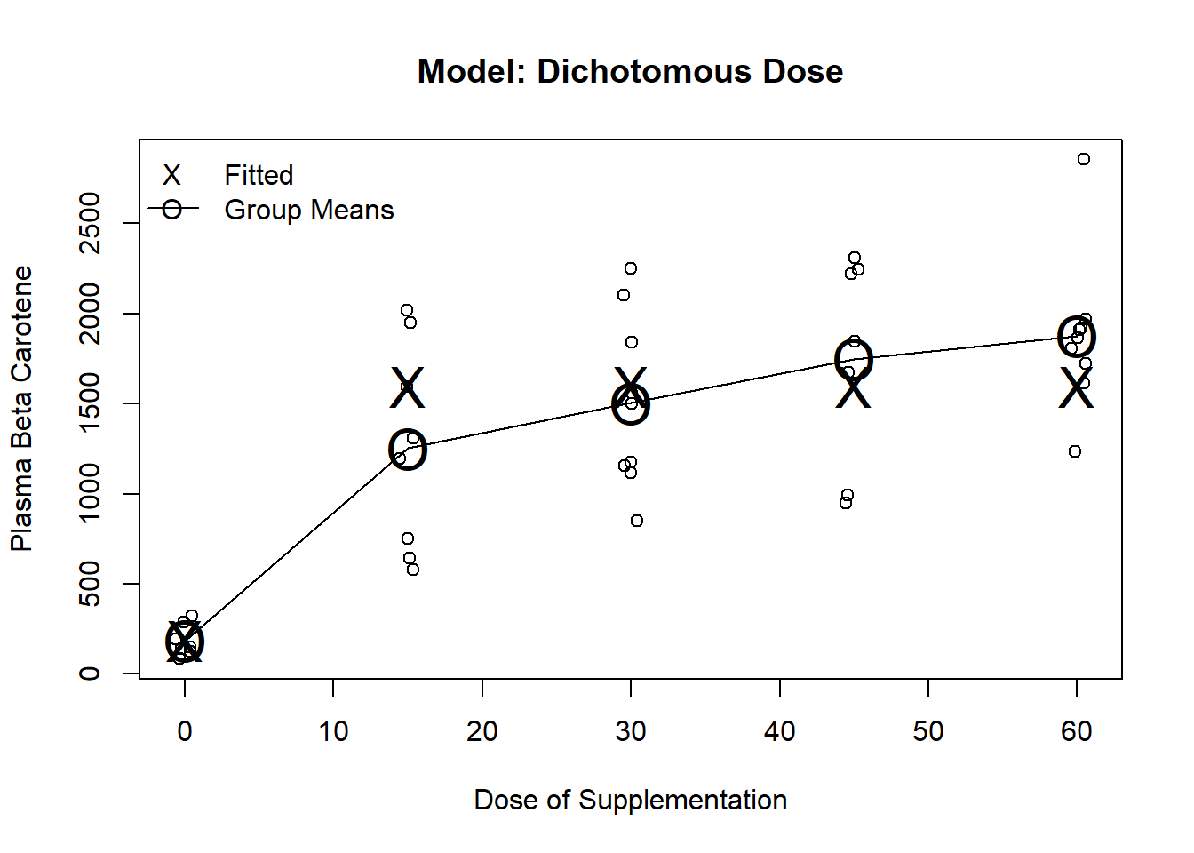 Next, fit each of the five models (linear, quadratic, ANOVA, dichotomized, and dichotomized plus linear)