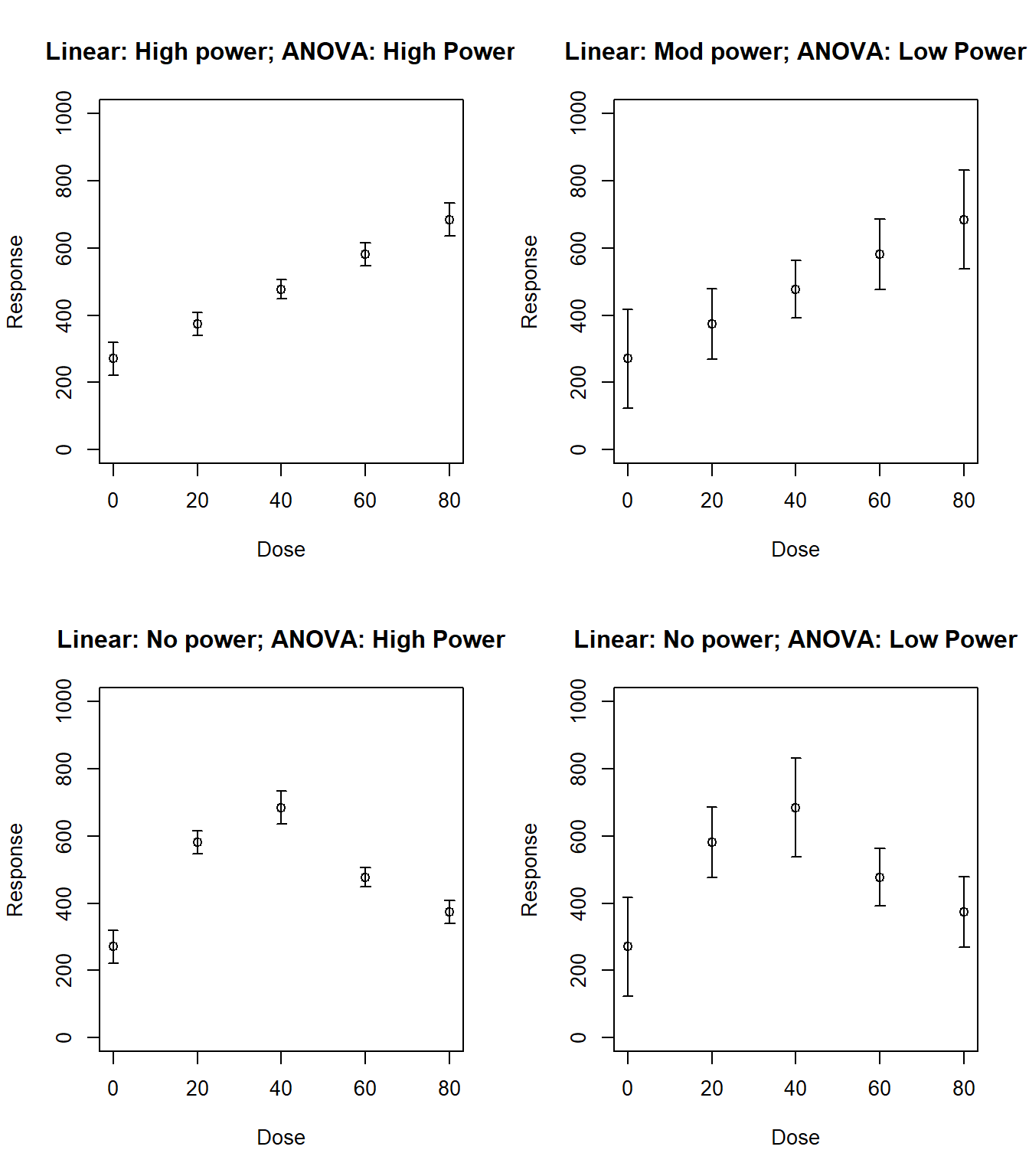 plotCI(x=dose.levels[c(1,5,4,2,3)], y=p1$fit, p1$se.fit, ylab="Response", xlab="Dose", ylim=c(0,1000), main="Linear: No power; ANOVA: High Power")